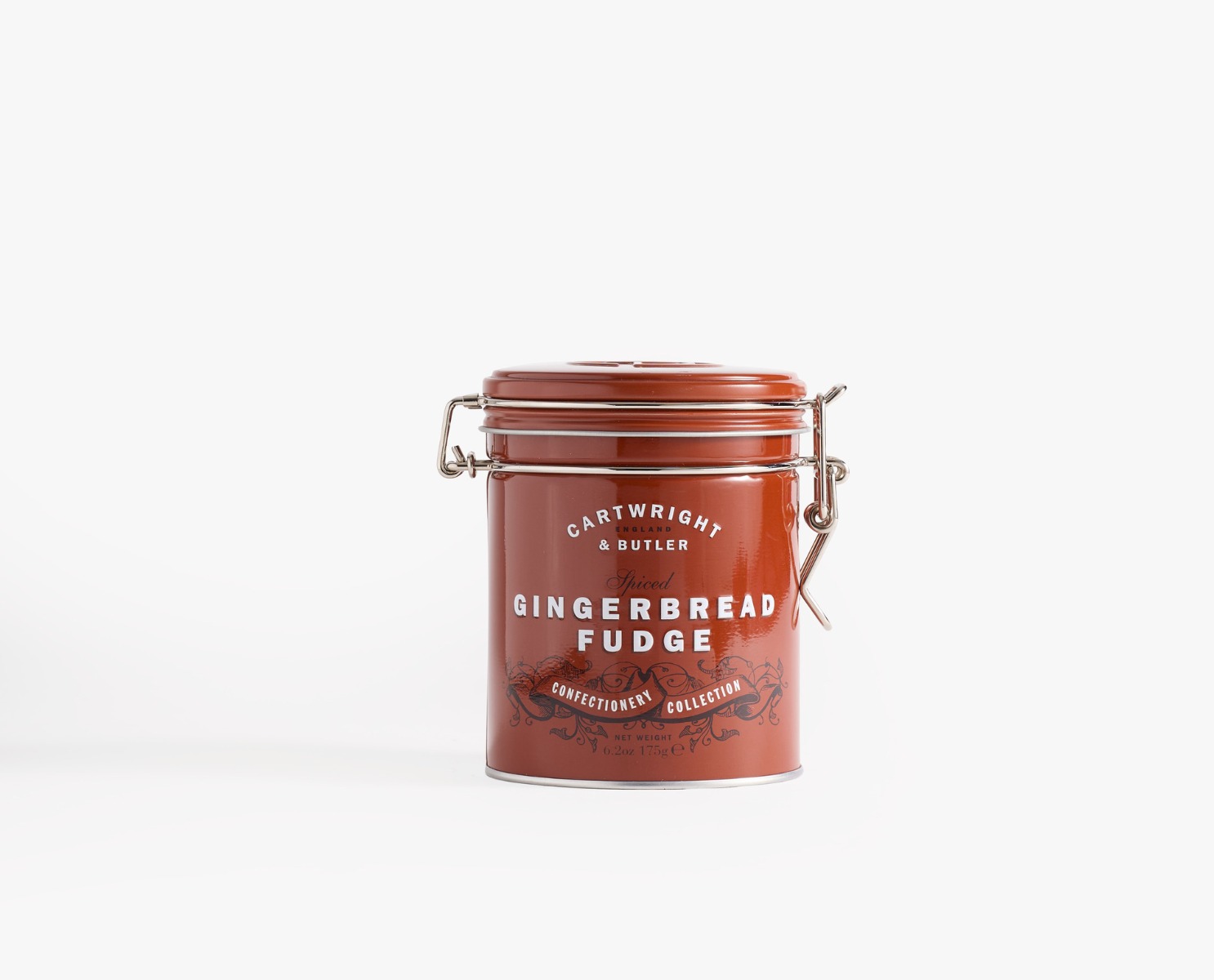 Our rich and creamy Gingerbread Fudge Tin makes for the perfect sweet treat. Made from a traditional all-butter recipe originating in Scotland, our Gingerbread Fudge has a delicious mixture of spicy ginger with hints of sticky treacle. Our Gingerbread Fudge is secured inside one of our beautifully-designed Cartwright & Butler clip-top jars offering a wide range of reusability, such as storing tea bags and biscuits.