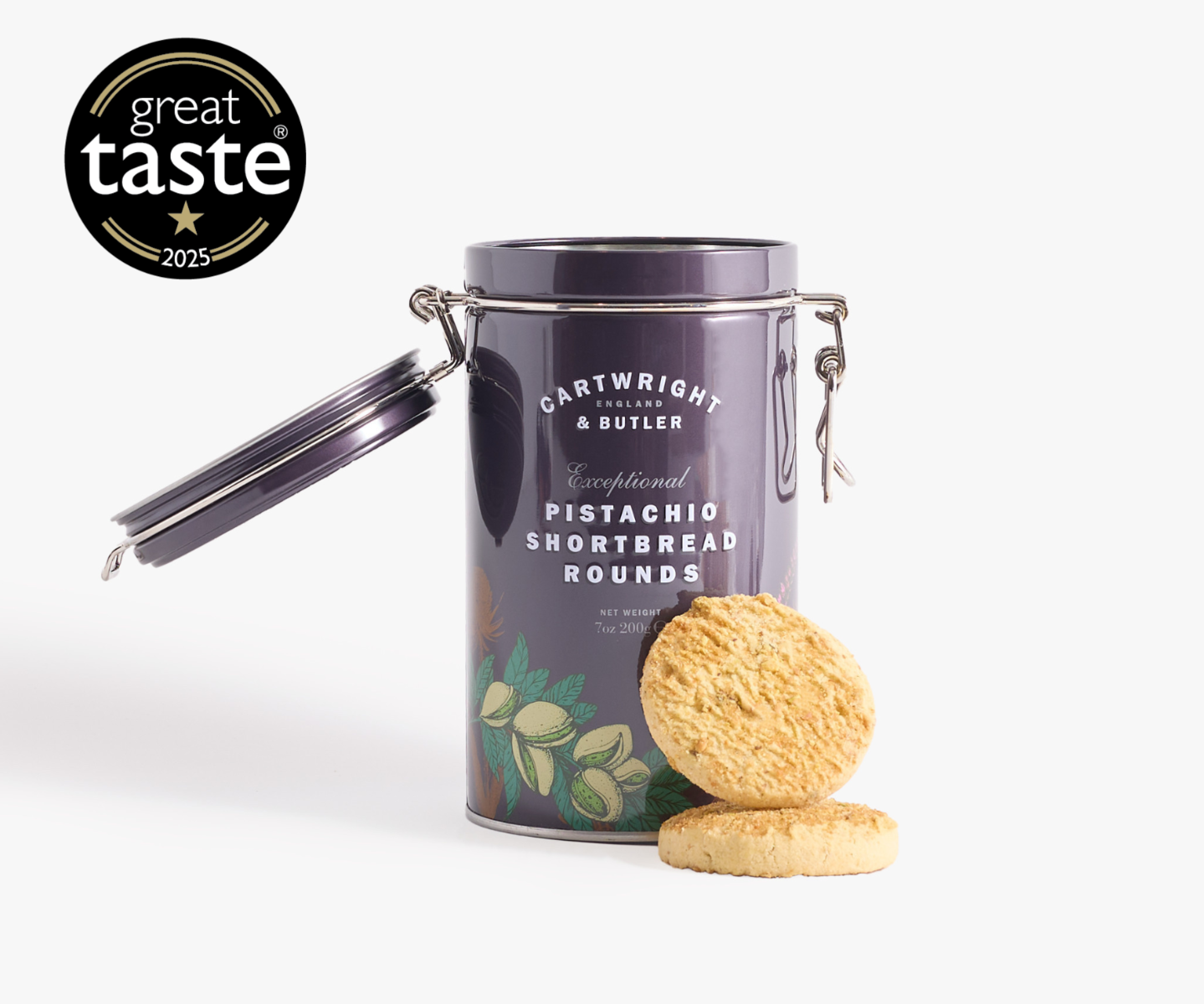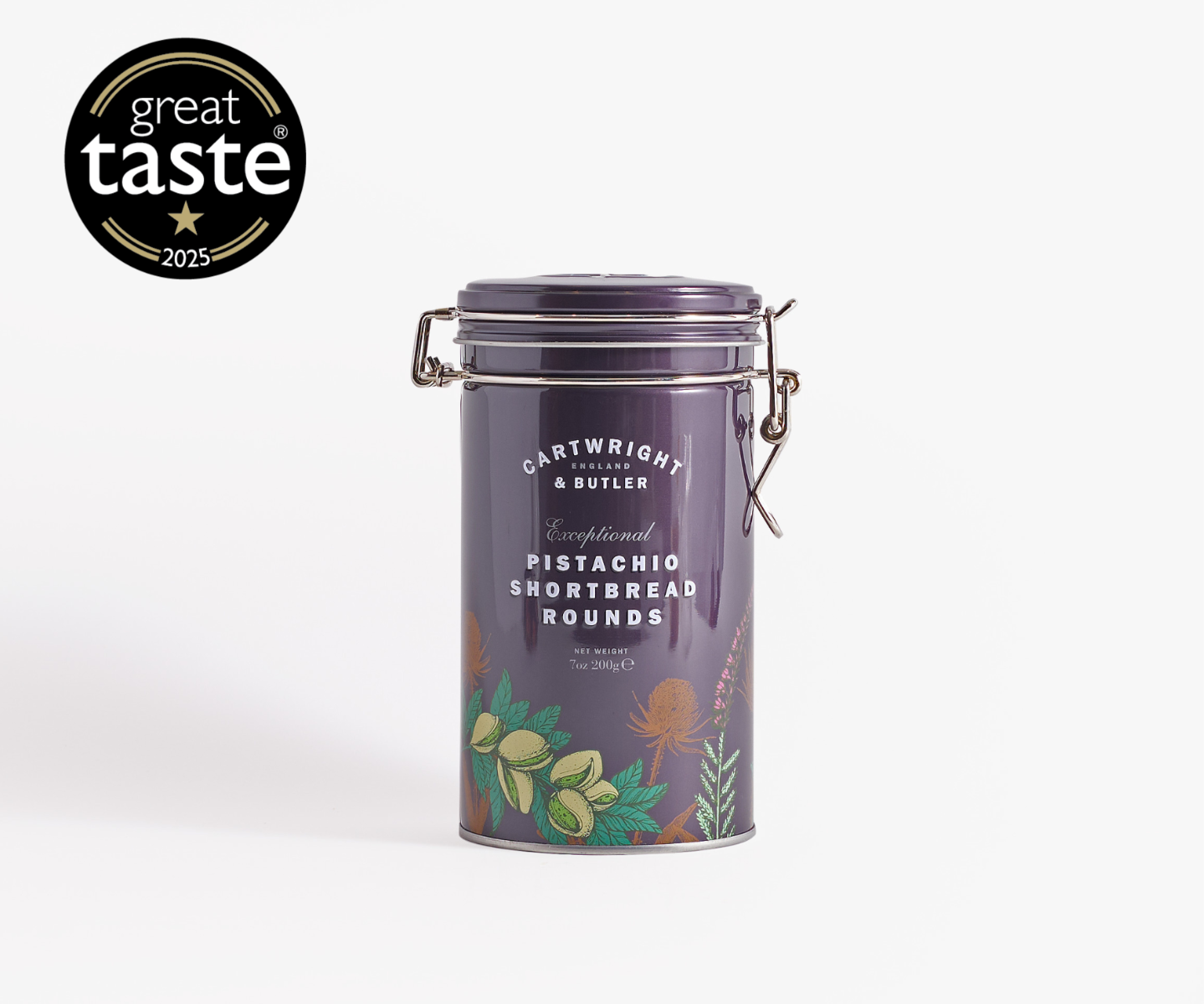 As with all our shortbread recipes, this is made the traditional way with heaps of butter and baked to that just-so crumbly texture. Here, we've added pistachios for a pleasantly nutty and almost savoury flavour and then lifted it with a sprinkling of Demerara sugar for a sweet, crunchy finish. Presented here in one of our signature biscuit tins, complete with a clip-lid.