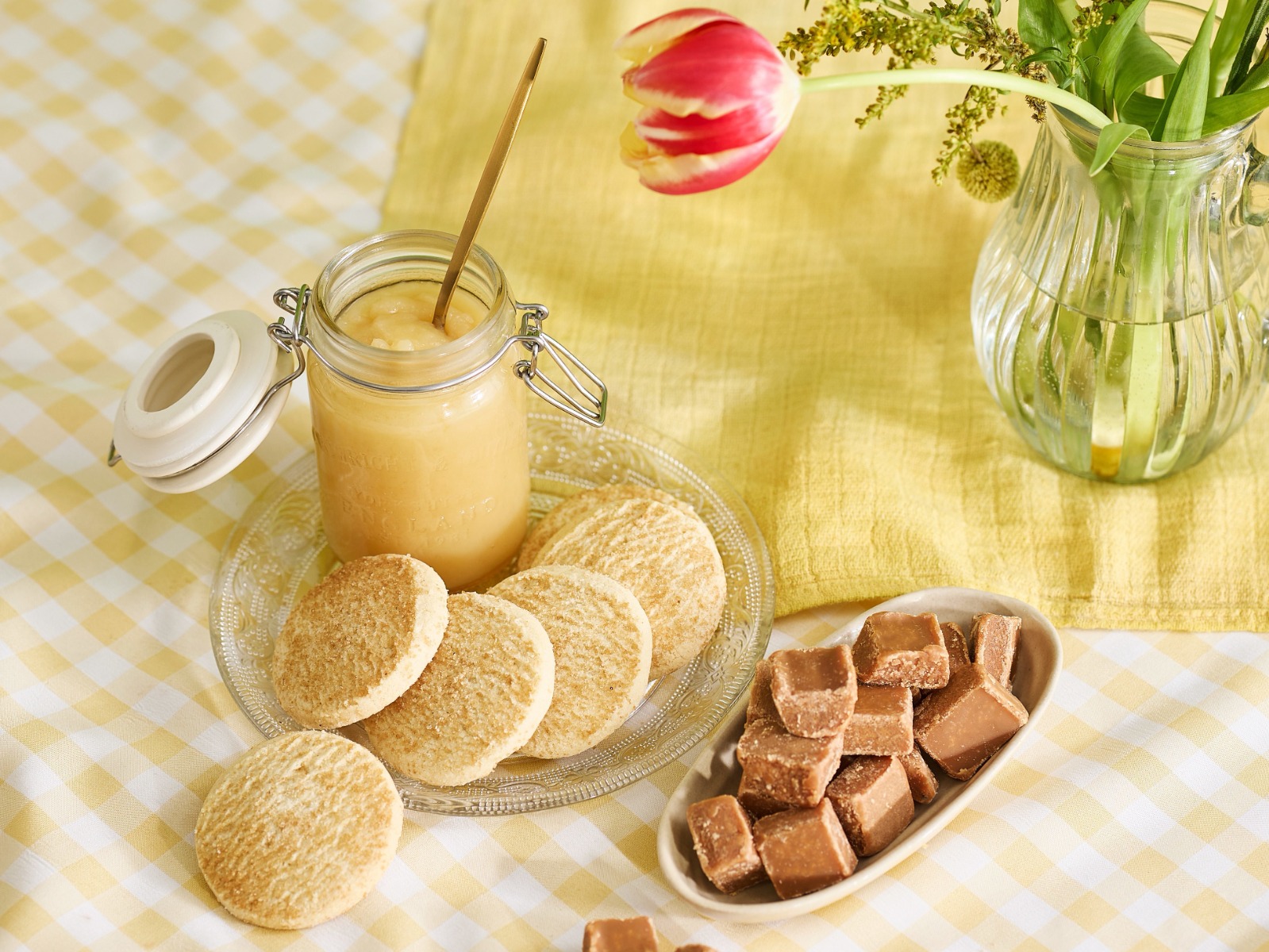 A lovely selection of treats, an ideal addition to any afternoon tea or a thoughtful gift for a friend. Including crumbly demerara shortbread rounds, creamy butter fudge, and zesty lemon curd.