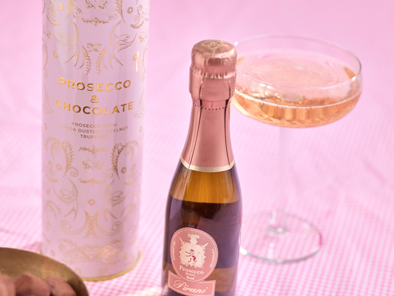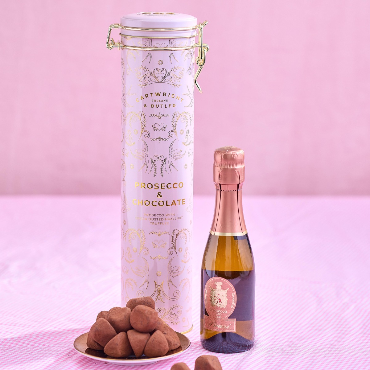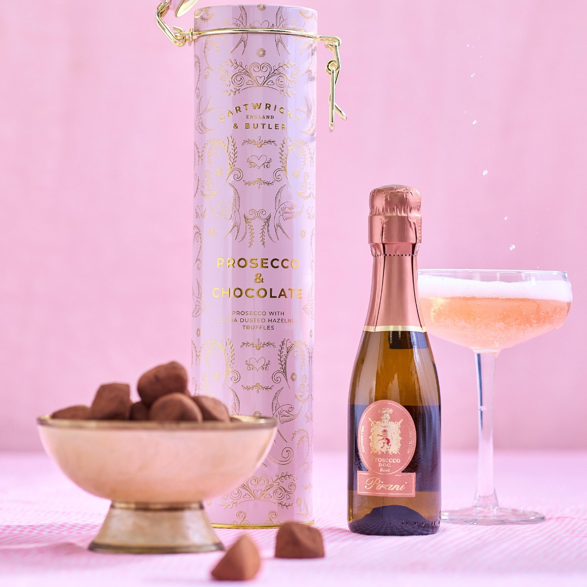 Celebrate any special occasion with this luxurious and beautifully hand-illustrated gift set. Melt-in-your-mouth dark chocolate gives way to an intense centre of hazelnut ganache. Dark and bitter-sweet chocolate is perfectly complemented by the crisp, fruity notes of bubbly prosecco to enhance the rich chocolate flavour all contained in a delightful light pink tin embossed with swallows and hearts.